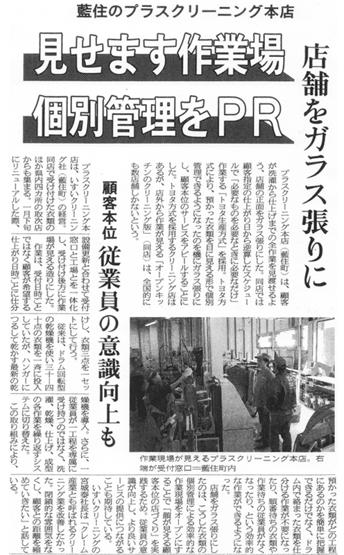 プラスクリーニング本店がガラス張りになり、外から工場の様子が見えるようになったことを記事にしていただきました。