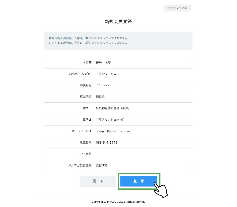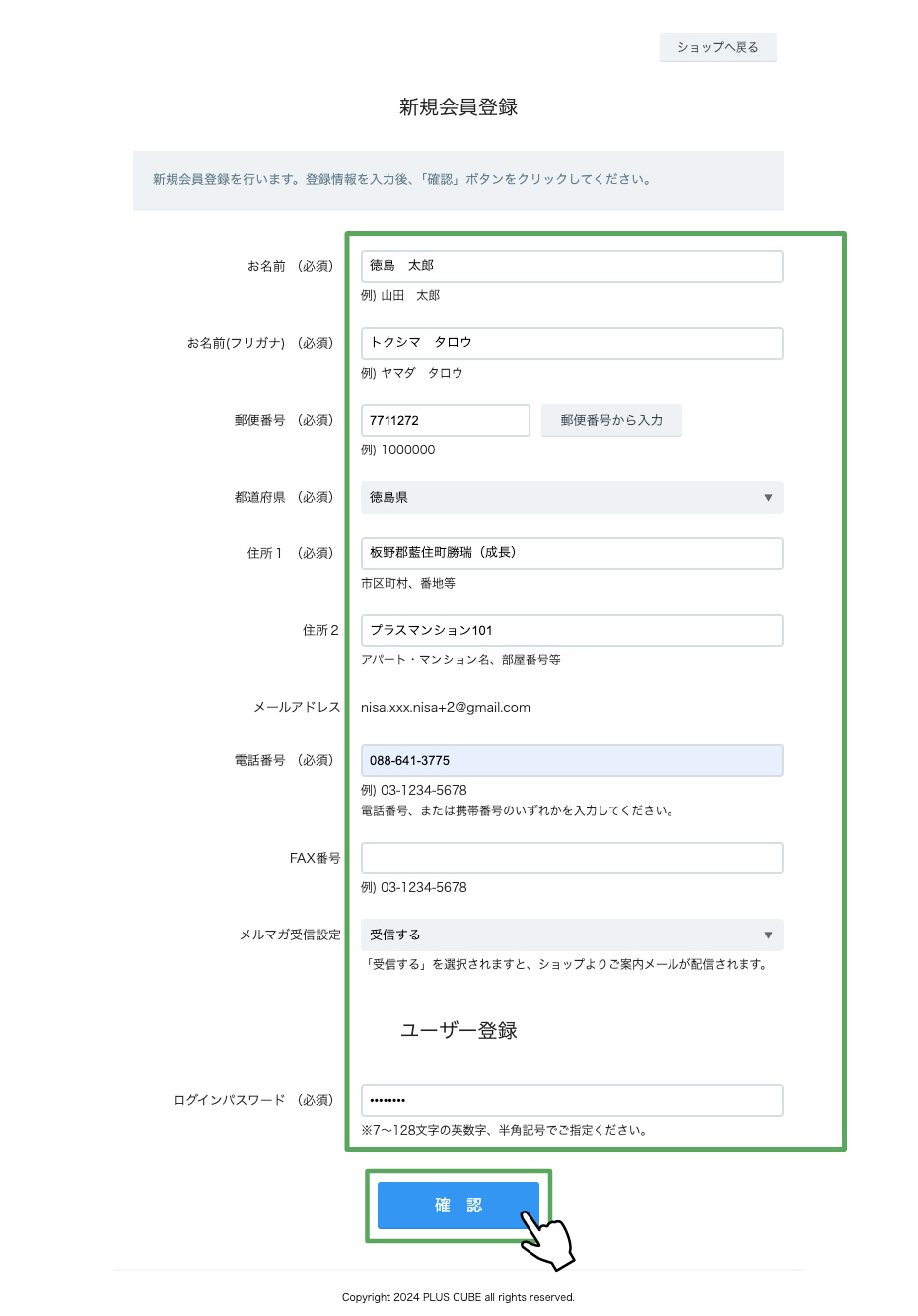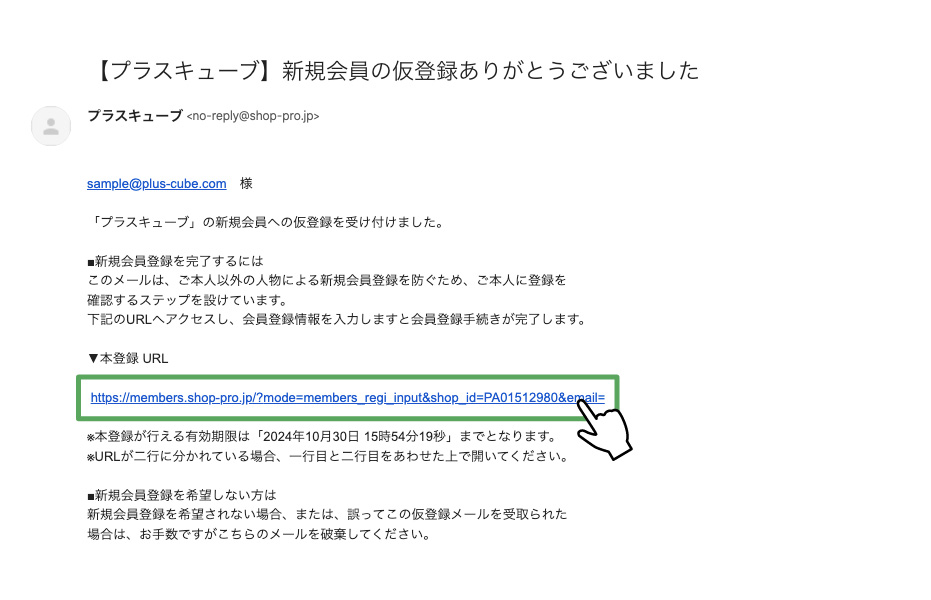 ※受信できなかった場合は、メールソフトの設定を確認し、【@shop-pro.jp】【@plus-cube.com】のドメインを受信許可してください。