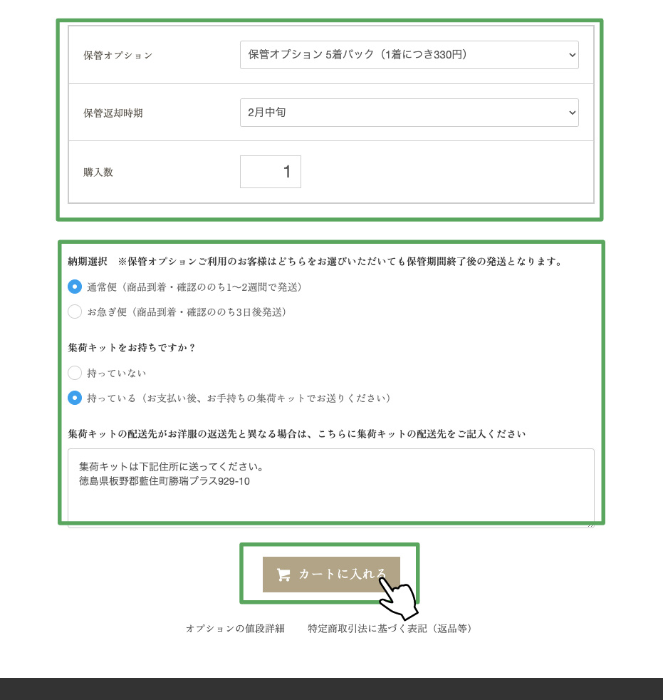 保管オプションご利用のお客様はどちらをお選びいただいても保管期間終了後の発送となります。