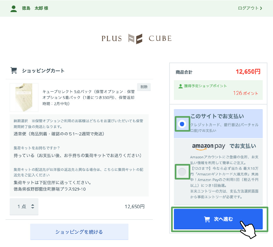 ご注文内容を確認して問題なければ、[このサイトでお支払い](Amazon payご利用の場合は[Amazon pay])を選択して[次へ進む]ボタンを押してください。